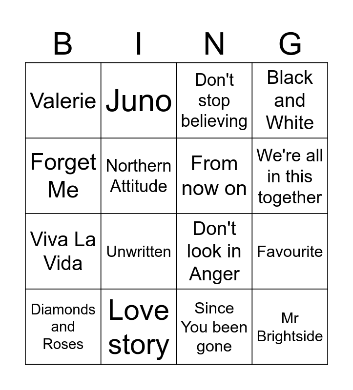 This bingo card has 46 words: Free!, Diamonds and Roses, Austin, Pink Pony Club, The night we met, Silver Springs, Juno, California Girls, Northern Attitude, Dawns, From now on, Black and White, Another Love, That's so True, Mamma Mia, The way I am, We're all in this together, Love story, Fairytale of New York, Forget Me, Favourite, Can't Hold Us, Valerie, Viva La Vida, Need you Now, Unwritten, Murder on the Dancefloor, Seventeen Going Under, Set Fire to the Rain, Mr Brightside, Teenage Dirtbag, Dreoilín, The CLimb, The Gaa, The Ska and the Ra, Life is a highway, Hit the Diff, Since You been gone, Story of my life, Little Talks, Low, Iris, Don't stop believing, Don't look in Anger, Dog Days are Over, Give me everything and Dreams.