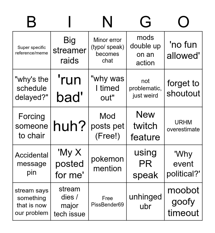 This bingo card has a free space and 38 words: phobic comment, "pls unban me", what is this message, 'run bad', 'Why event political?', 'My X posted for me', "why was I timed out", 'mods bad', 'no fun allowed', not problematic, just weird, huh?, mods double up on an action, moobot goofy timeout, URHM overestimate, "why's the schedule delayed?", Accidental message pin, Trolls, Minor error (typo/ speak) becomes chat, 'they're peddling / stalling', New twitch feature, Super specific reference/meme, stream dies / major tech issue, forget to shoutout, stream says something that is now our problem, "MODS!", Free PissBender69, Learning a new slur, oh no, time was mentioned, p a n i c, Orb Redeem, accidental swear, pokemon mention, unhinged ubr, Big streamer raids, "where's x??", using PR speak, Forcing someone to chair and Someone falls asleep at computer.