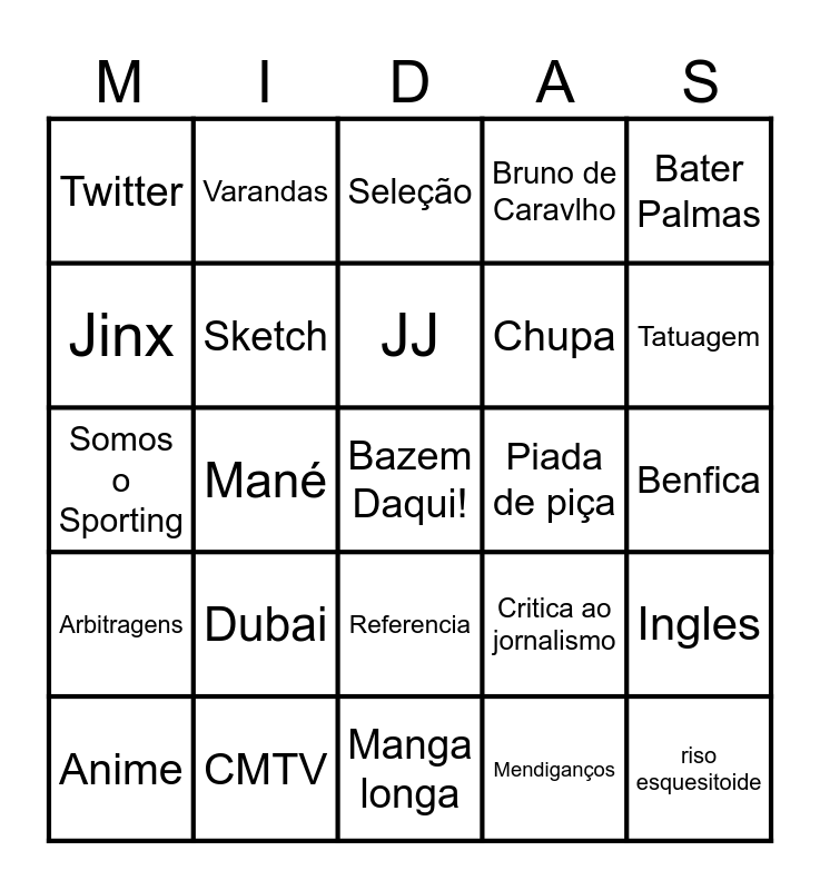 This bingo card has a free space and 33 words: Random, Esgaio, Mané, Preto e Branco, Arbitragens, Sketch, Bater Palmas, Anime, Varandas, memes pré-historicos, JJ, Seleção, Tripeiros, Pessimismo, Piada de piça, Tatuagem, CMTV, Somos o Sporting, Dubai, Critica ao jornalismo, Referencia, Pato-Adán, Twitter, Benfica, Manga longa, riso esquesitoide, Bruno de Caravlho, Chupa, Jinx, Ingles, P*rra, Mendiganços and Off-Topic.