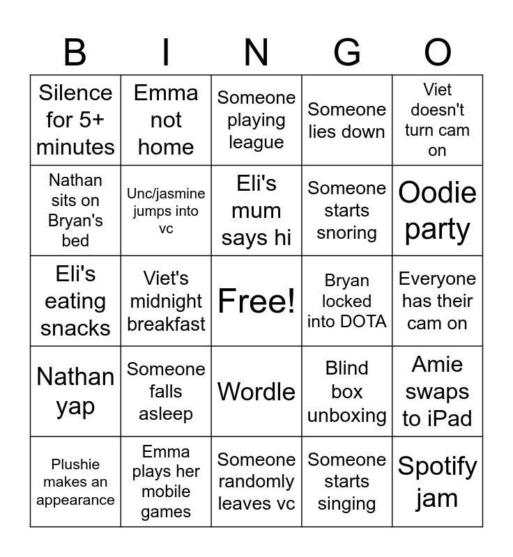 This bingo card has a free space and 25 words: Someone falls asleep, Someone randomly leaves vc, Eli's mum says hi, Plushie makes an appearance, Viet doesn't turn cam on, Silence for 5+ minutes, Nathan sits on Bryan's bed, Emma not home, Bryan locked into DOTA, Wordle, Someone starts snoring, Eli's eating snacks, Blind box unboxing, Amie swaps to iPad, Unc/jasmine jumps into vc, Cookie jumps up, Everyone has their cam on, Someone playing league, Oodie party, Viet's midnight breakfast, Spotify jam, Emma plays her mobile games, Nathan yap, Someone lies down and Someone starts singing.