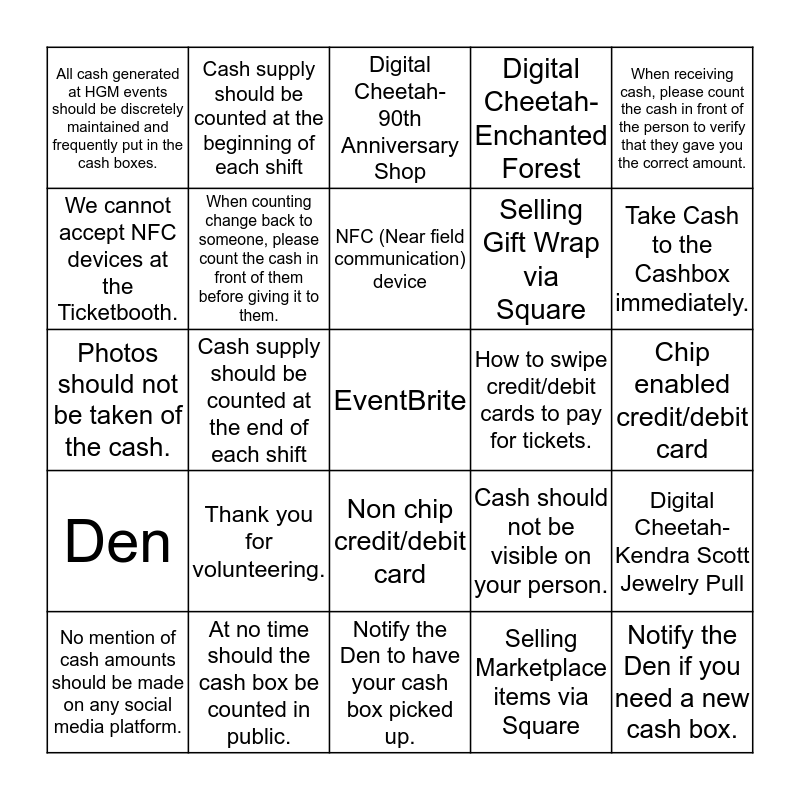 This bingo card has 25 words: Thank you for volunteering., Notify the Den to have your cash box picked up., NFC (Near field communication) device, No mention of cash amounts should be made on any social media platform., When receiving cash, please count the cash in front of the person to verify that they gave you the correct amount., All cash generated at HGM events should be discretely maintained and frequently put in the cash boxes., We cannot accept NFC devices at the Ticketbooth., Cash supply should be counted at the beginning of each shift, How to swipe credit/debit cards to pay for tickets., Non chip credit/debit card, Selling Gift Wrap via Square, Photos should not be taken of the cash., Cash should not be visible on your person., Digital Cheetah-Kendra Scott Jewelry Pull, When counting change back to someone, please count the cash in front of them before giving it to them., Notify the Den if you need a new cash box., Chip enabled credit/debit card, Digital Cheetah-90th Anniversary Shop, Take Cash to the Cashbox immediately., Cash supply should be counted at the end of each shift, EventBrite, At no time should the cash box be counted in public., Den, Digital Cheetah-Enchanted Forest and Selling Marketplace items via Square.