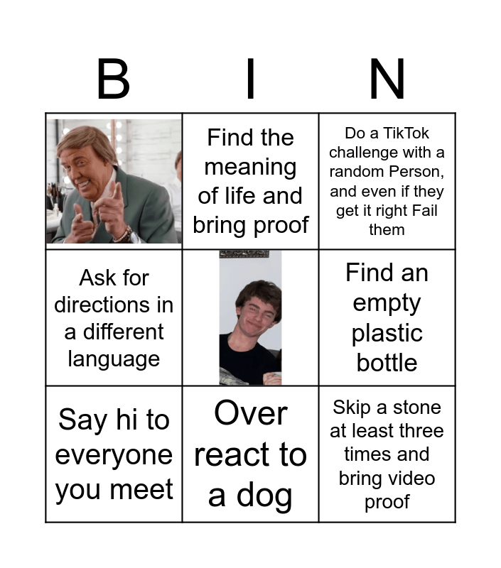 This bingo card has 3 images and 9 words: Take a selfie with a stranger, Over react to a dog, Skip a stone at least three times and bring video proof, Ask for directions in a different language, Find the meaning of life and bring proof, Find an empty plastic bottle, Say hi to everyone you meet, Eat a Delicious bug and Do a TikTok challenge with a random Person, and even if they get it right Fail them.