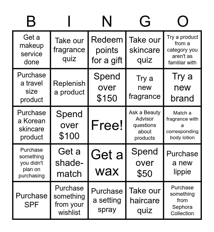 This bingo card has a free space and 24 words: Get a shade-match, Purchase something from your wishlist, Spend over $150, Purchase SPF, Try a product from a category you aren't as familiar with, Get a makeup service done, Purchase a travel size product, Take our fragrance quiz, Ask a Beauty Advisor questions about products, Get a wax, Try a new fragrance, Purchase a Korean skincare product, Spend over $50, Purchase a new lippie, Replenish a product, Take our haircare quiz, Match a fragrance with a corresponding body lotion, Redeem points for a gift, Try a new brand, Spend over $100, Purchase something from Sephora Collection, Purchase something you didn't plan on purchasing, Take our skincare quiz and Purchase a setting spray.
