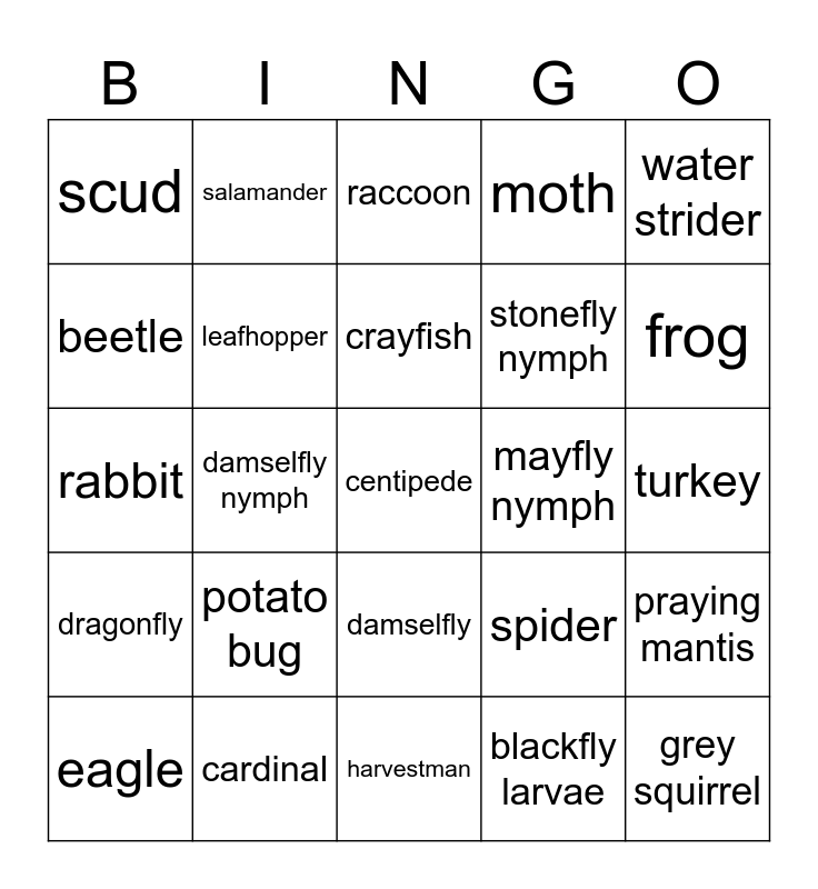 This bingo card has 49 words: Free!, centipede, ant, harvestman, potato bug, stink bug, salamander, butterfly, beetle, katydid, leafhopper, moth, praying mantis, spider, tick, wasp, crayfish, mayfly nymph, dobsonfly larvae, water strider, damselfly nymph, blackfly larvae, scud, stonefly nymph, caddisfly larvae, frog, eagle, duck, damselfly, dragonfly, woodpecker, turkey vulture, hawk, bluebird, cardinal, chickadee, blue jay, robin, turkey, hummingbird, deer, fox, grey squirrel, mouse, rabbit, raccoon, red squirrel, snake and toad.