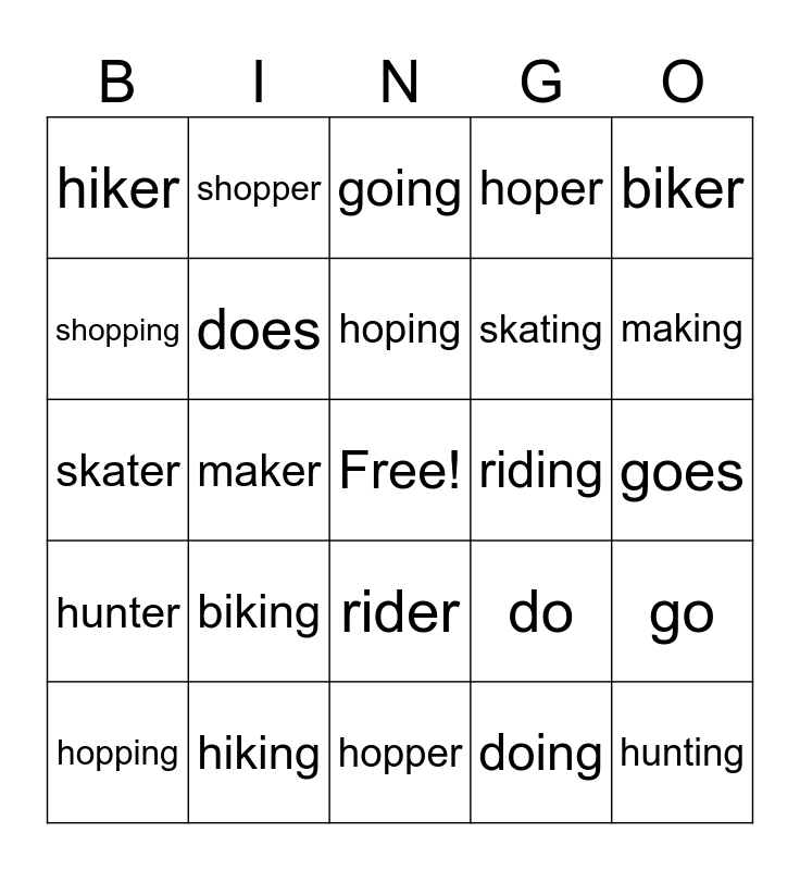 This bingo card has a free space and 24 words: biking, hiking, hoping, hopping, biker, hiker, shopping, shopper, riding, rider, skating, skater, do, go, does, doing, goes, going, making, maker, hunting, hunter, hoper and hopper.