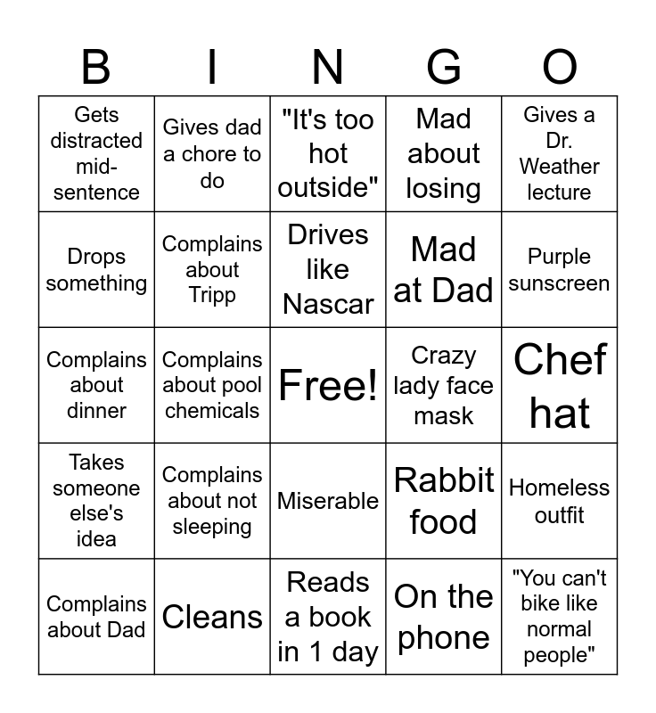 This bingo card has a free space and 24 words: Complains about not sleeping, Cleans, Drives like Nascar, Complains about Dad, Gives a Dr. Weather lecture, Gets distracted mid-sentence, Drops something, Gives dad a chore to do, Crazy lady face mask, Miserable, Mad at Dad, Complains about dinner, Rabbit food, Homeless outfit, Complains about Tripp, On the phone, Chef hat, "It's too hot outside", Purple sunscreen, Complains about pool chemicals, "You can't bike like normal people", Takes someone else's idea, Mad about losing and Reads a book in 1 day.