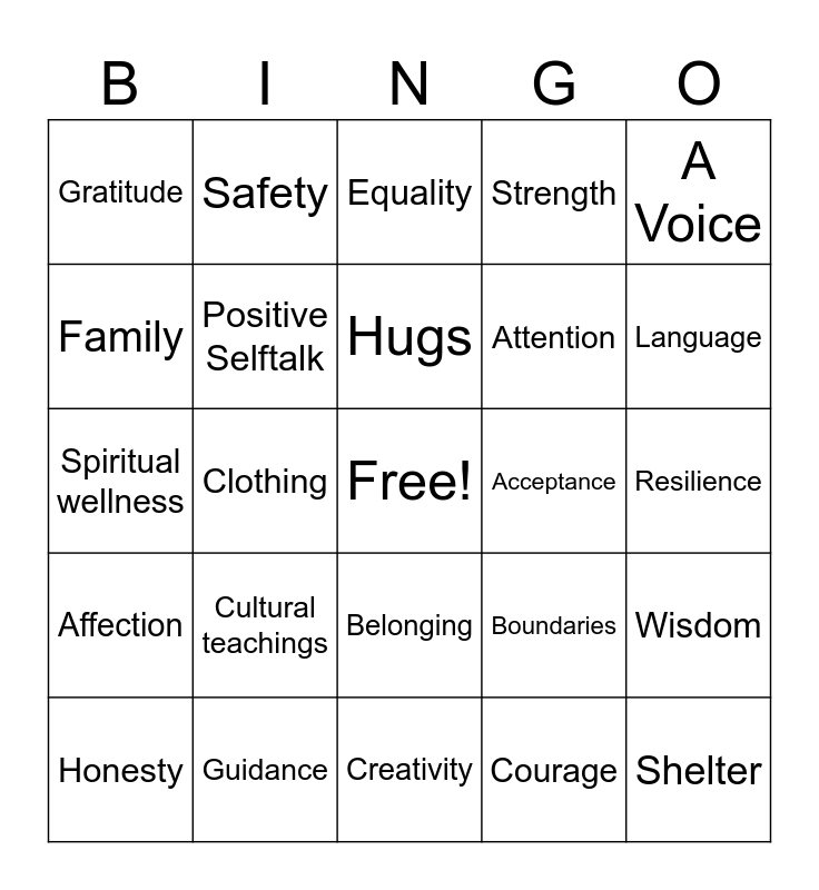 This bingo card has a free space and 75 words: Heritage, Opportunities, Equality, Choices, Food, Care, Responsibility, Dental care, Routine, Empathy, Encouragement, Healthcare, Hugs, Family, Community, Clothing, Learning, Shelter, Physical wellness, A Voice, Compassion, Spiritual wellness, Positive Selftalk, Safety, Strength, Water, Nutrition, Education, Peace, Support, Values, Security, Respect, Boundaries, Language, Attention, Humility, Stability, Resilience, Courage, Play, Love, Emotional wellness, Independence, Accountability, Friends, Honesty, Gratitude, Happiness, Understanding, Patience, Belonging, Truth, Self-esteem, Structure, Praise, Communication, Mental wellness, Motivation, Freedom, Cultural teachings, Fairness, Kindness, Bravery, Loyalty, Acceptance, Connection, Identity, Goals, Wisdom, Affection, Guidance, Beliefs/Religion, Creativity and Confidence.