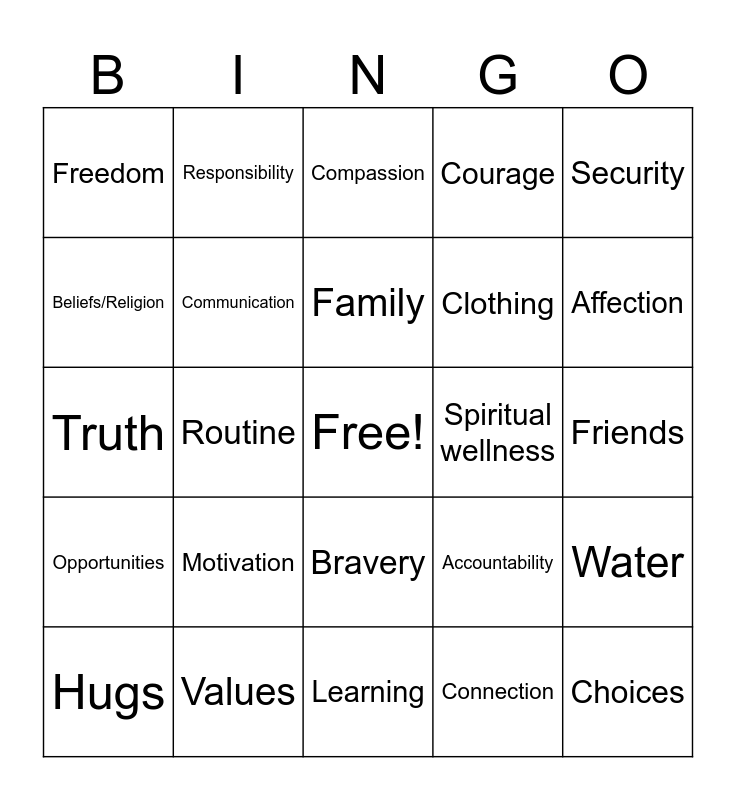 This bingo card has a free space and 75 words: Self-esteem, Belonging, Compassion, Wisdom, Strength, Praise, Empathy, Loyalty, Equality, Positive Selftalk, Heritage, Kindness, Family, Beliefs/Religion, Emotional wellness, Routine, Healthcare, Choices, Nutrition, Security, Stability, Truth, Communication, Responsibility, Courage, Honesty, Cultural teachings, Dental care, Peace, Mental wellness, Safety, Support, Creativity, Accountability, Affection, Clothing, Boundaries, Guidance, Friends, Connection, Independence, Humility, Community, Care, Encouragement, Structure, Hugs, Freedom, Respect, Patience, A Voice, Bravery, Shelter, Understanding, Food, Resilience, Fairness, Goals, Physical wellness, Attention, Motivation, Play, Acceptance, Language, Confidence, Spiritual wellness, Happiness, Gratitude, Love, Water, Opportunities, Values, Education, Learning and Identity.