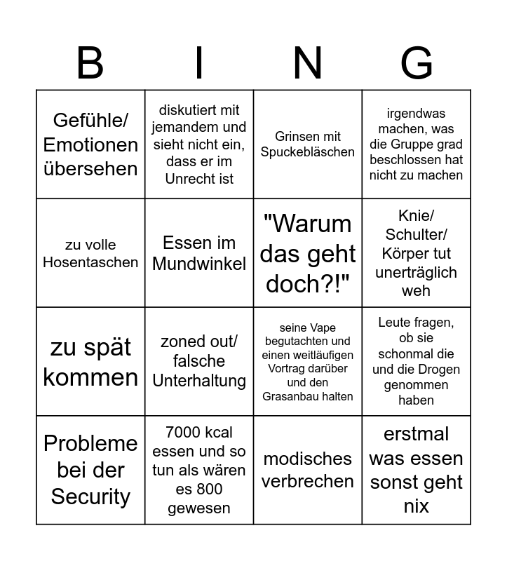 This bingo card has 16 words: 7000 kcal essen und so tun als wären es 800 gewesen, Leute fragen, ob sie schonmal die und die Drogen genommen haben, Grinsen mit Spuckebläschen, Gefühle/ Emotionen übersehen, zu spät kommen, diskutiert mit jemandem und sieht nicht ein, dass er im Unrecht ist, seine Vape begutachten und einen weitläufigen Vortrag darüber und den Grasanbau halten, modisches verbrechen, zu volle Hosentaschen, Essen im Mundwinkel, Probleme bei der Security, irgendwas machen, was die Gruppe grad beschlossen hat nicht zu machen, zoned out/ falsche Unterhaltung, Knie/ Schulter/ Körper tut unerträglich weh, "Warum das geht doch?!" and erstmal was essen sonst geht nix.