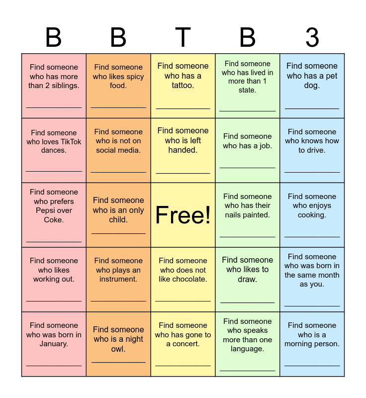 This bingo card has a free space and 24 words: Find someone who was born in January. _____________, Find someone who plays an instrument. _____________, Find someone who is left handed. ____________, Find someone who speaks more than one language. _____________, Find someone who has a pet dog. ____________, Find someone who has more than 2 siblings. _____________, Find someone who likes spicy food. _____________, Find someone who has a tattoo. ____________, Find someone who has their nails painted. _____________, Find someone who enjoys cooking. _____________, Find someone who prefers Pepsi over Coke. _____________, Find someone who is not on social media. _____________, Find someone who likes to draw. ____________, Find someone who was born in the same month as you. _____________, Find someone who loves TikTok dances. ______________, Find someone who is a night owl. ____________, Find someone who has gone to a concert. _____________, Find someone who has lived in more than 1 state. ______________, Find someone who knows how to drive. _____________, Find someone who likes working out. _____________, Find someone who is an only child. ____________, Find someone who does not like chocolate. _____________, Find someone who has a job. _____________ and Find someone who is a morning person. _____________.