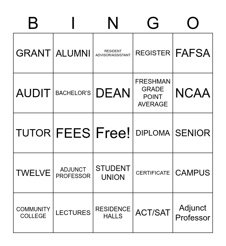 This bingo card has a free space and 53 words: ACT/SAT, Adjunct Professor, Advisor, ACT/SAT, ADJUNCT PROFESSOR, ADVISOR, ALUMNI, APPLICATION, AUDIT, ASSOCIATE’S, BACHELOR’S, BOARD OF TRUSTEES, CAMPUS, CERTIFICATE, COMMENCEMENT, COMMUNITY COLLEGE, DEAN, DIPLOMA, DORMS, FAFSA, FEES, FINANCIAL AID, FRESHMAN GRADE POINT AVERAGE, GRANT, JUNIOR, LECTURES, LOAN MAJOR, MASTER’S, MINOR, NCAA, OFFICE HOURS, PERSONAL ESSAY, Ph.D., PREREQUISITE, PROFESSOR, QUARTERS, REGISTER, RESIDENCE HALLS, RESIDENT ADVISOR/ASSISTANT, ROOM AND BOARD, SCHOLARSHIP, SEMESTERS, SENIOR, SIXTY-SEVEN PERCENT, SOPHOMORE, STUDENT UNION, TRANSCRIPT, TUITION, TUTOR, TWELVE, UNIVERSITY, VOC/TRADE SCHOOL and WORK STUDY.