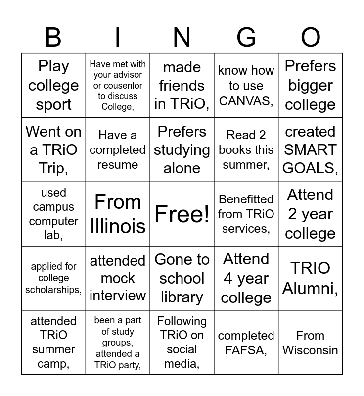 This bingo card has a free space and 28 words: TRIO Alumni,, likes to dine out,, Read 2 books this summer,, completed FAFSA,, Went on a TRiO Trip,, made friends in TRiO,, Have met with your advisor or cousenlor to discuss College,, applied for college scholarships,, Benefitted from TRiO services,, attended TRiO summer camp,, used campus computer lab,, know how to use CANVAS,, been a part of study groups, attended a TRiO party,, Following TRiO on social media,, created SMART GOALS,, participated in a student organization,, attended mock interview, Have a completed resume, Prefers studying alone, Gone to school library, Play college sport, Play intramural college sports, From Wisconsin, From Illinois, Attend 2 year college, Attend 4 year college, Prefers bigger college and Prefers smaller college.