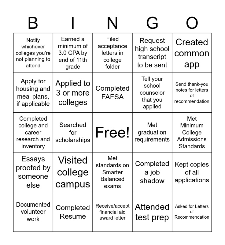 This bingo card has a free space and 32 words: Attended test prep, Took the SAT or ACT, Searched for scholarships, Wrote scholarship essays, Essays proofed by someone else, Applied to 3 or more colleges, Created common app, Kept copies of all applications, Earned a minimum of 3.0 GPA by end of 11th grade, Got an FSA ID, Completed FAFSA, Filed acceptance letters in college folder, Conducted research on 3-5 postsecondary programs, Passed Algebra., Met graduation requirements, Signed up for free dual credit classes, Documented volunteer work, Completed college and career research and inventory, Met standards on Smarter Balanced exams, Visited college campus, Completed a job shadow, Created a savings account, Met Minimum College Admissions Standards, Completed Resume, Asked for Letters of Recommendation, Request high school transcript to be sent, Tell your school counselor that you applied, Apply for housing and meal plans, if applicable, Notify whichever colleges you’re not planning to attend, Receive/accept financial aid award letter, Set up a professional-sounding email address and Send thank-you notes for letters of recommendation.