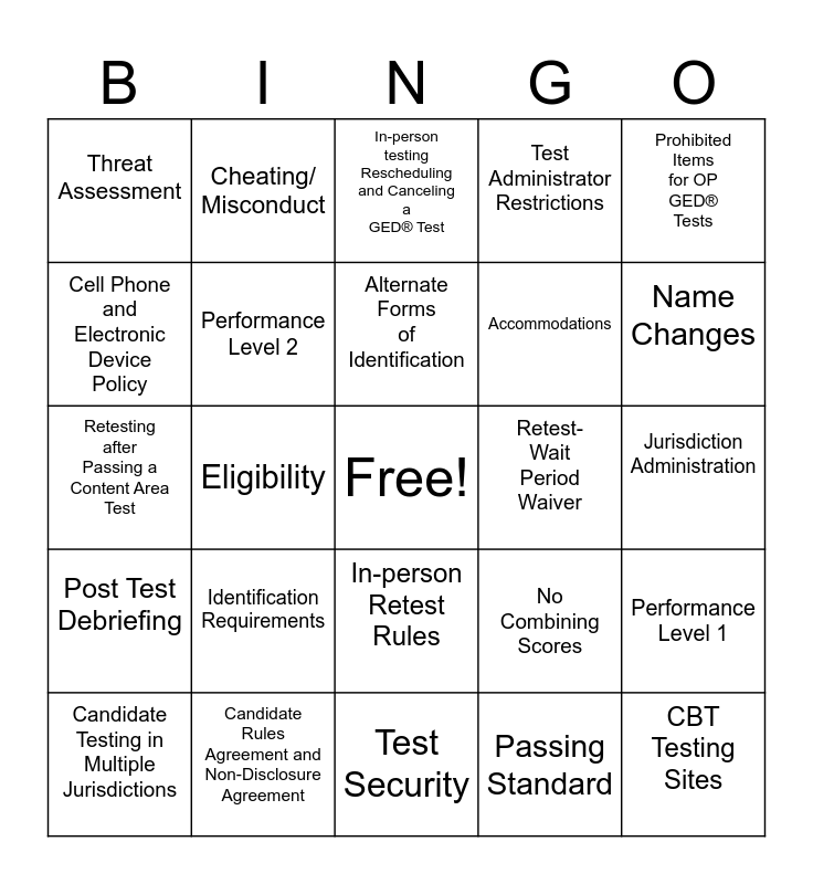 This bingo card has a free space and 24 words: Identification Requirements, Candidate Rules Agreement and Non-Disclosure Agreement, Alternate Forms of Identification, Candidate Testing in Multiple Jurisdictions, Prohibited Items for OP GED® Tests, Threat Assessment, Cell Phone and Electronic Device Policy, Cheating/ Misconduct, Retest-Wait Period Waiver, In-person Retest Rules, Accommodations, Retesting after Passing a Content Area Test, No Combining Scores, Performance Level 1, Performance Level 2, Passing Standard, Jurisdiction Administration, In-person testing Rescheduling and Canceling a GED® Test, Name Changes, Eligibility, CBT Testing Sites, Post Test Debriefing, Test Administrator Restrictions and Test Security.