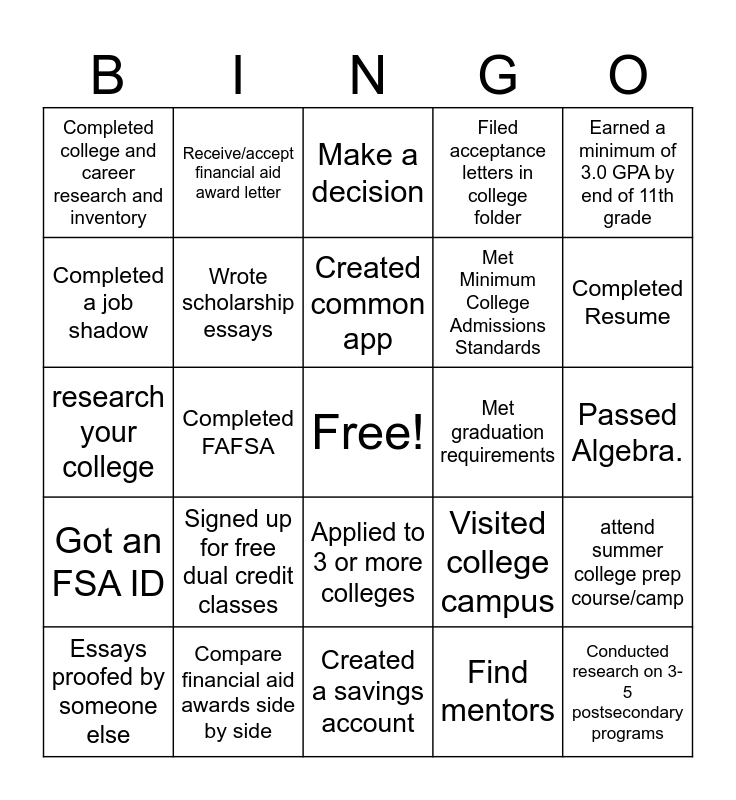 This bingo card has a free space and 39 words: Attended test prep, Took the SAT or ACT, Searched for scholarships, Wrote scholarship essays, Essays proofed by someone else, Applied to 3 or more colleges, Created common app, Kept copies of all applications, Earned a minimum of 3.0 GPA by end of 11th grade, Got an FSA ID, Completed FAFSA, Filed acceptance letters in college folder, Conducted research on 3-5 postsecondary programs, Passed Algebra., Met graduation requirements, Signed up for free dual credit classes, Documented volunteer work, Completed college and career research and inventory, Met standards on Smarter Balanced exams, Visited college campus, Completed a job shadow, Created a savings account, Met Minimum College Admissions Standards, Completed Resume, Asked for Letters of Recommendation, Request high school transcript to be sent, Tell your school counselor that you applied, Apply for housing and meal plans, if applicable, Notify whichever colleges you’re not planning to attend, Receive/accept financial aid award letter, Set up a professional-sounding email address, Send thank-you notes for letters of recommendation, Make a decision, Compare financial aid awards side by side, Find mentors, Sleep 8-10 hours, attend summer college prep course/camp, research your college and set up college campus visit virtually/inperson.