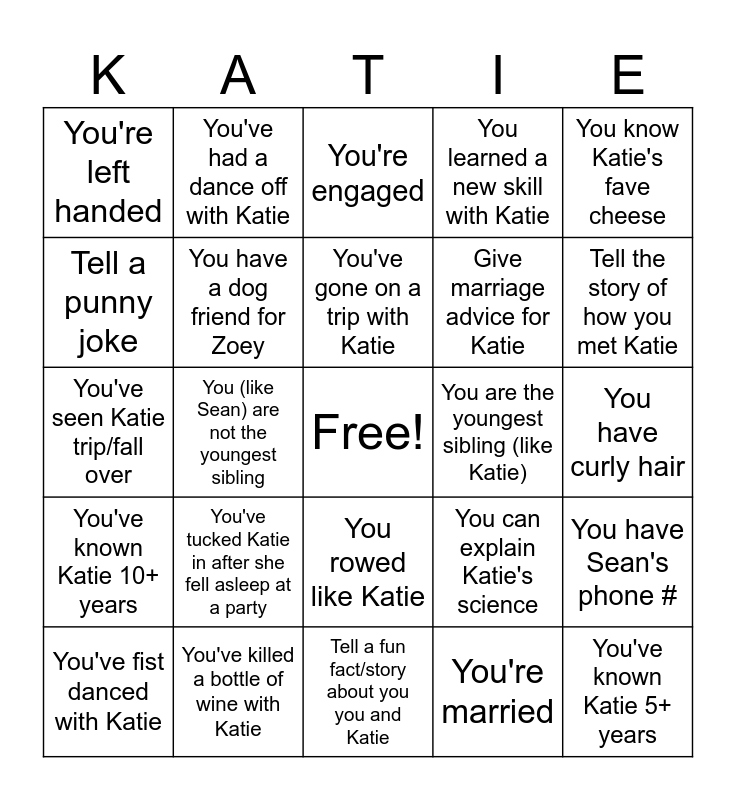 This bingo card has a free space and 24 words: You've tucked Katie in after she fell asleep at a party, You've killed a bottle of wine with Katie, You've gone on a trip with Katie, You've fist danced with Katie, You know Katie's fave cheese, You're left handed, Tell a punny joke, You've had a dance off with Katie, You are the youngest sibling (like Katie), You rowed like Katie, Give marriage advice for Katie, You've seen Katie trip/fall over, You can explain Katie's science, You have Sean's phone #, You have a dog friend for Zoey, You're married, You have curly hair, You're engaged, Tell the story of how you met Katie, You (like Sean) are not the youngest sibling, You've known Katie 5+ years, You've known Katie 10+ years, You learned a new skill with Katie and Tell a fun fact/story about you you and Katie.