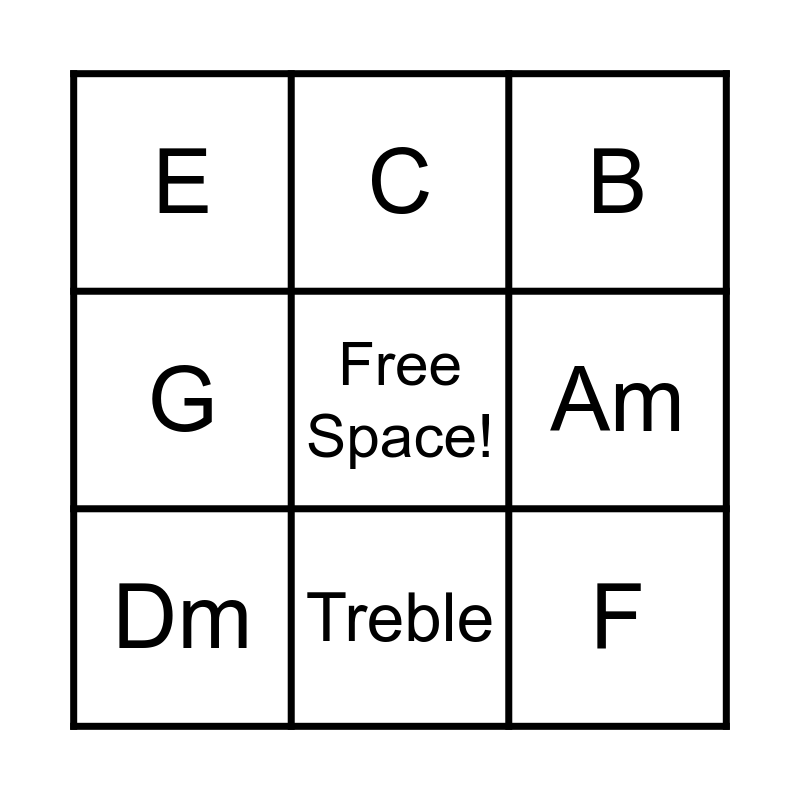 This bingo card has a free space and 8 words: Am, B, C, Dm, E, F, G and Treble.