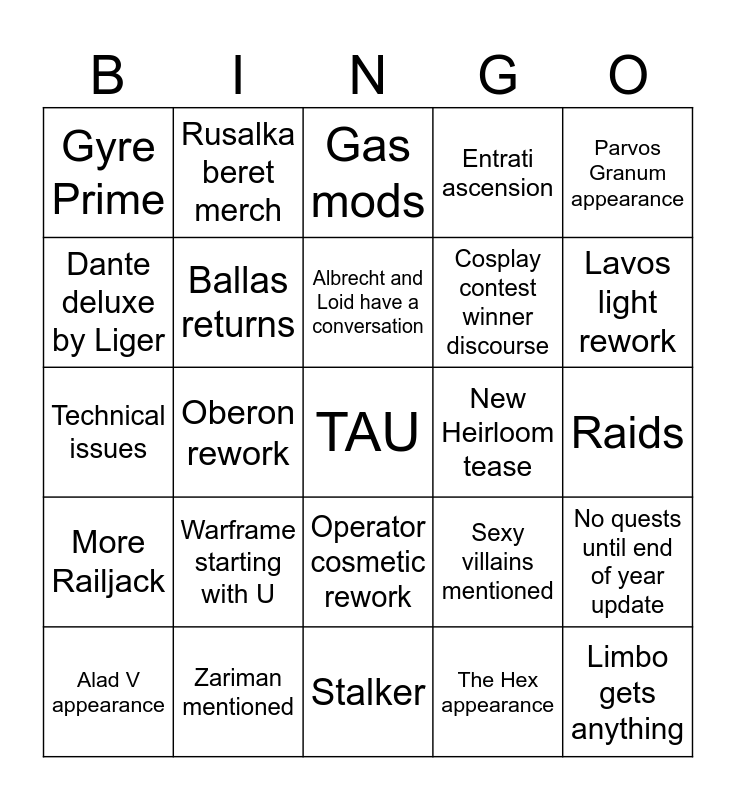 This bingo card has a free space and 24 words: Warframe starting with U, Zariman mentioned, Albrecht and Loid have a conversation, Alad V appearance, Parvos Granum appearance, Gyre Prime, Dante deluxe by Liger, Rusalka beret merch, New Heirloom tease, Operator cosmetic rework, Cosplay contest winner discourse, Technical issues, Sexy villains mentioned, No quests until end of year update, Ballas returns, The Hex appearance, Raids, Gas mods, Lavos light rework, Oberon rework, Limbo gets anything, More Railjack, Entrati ascension and Stalker.