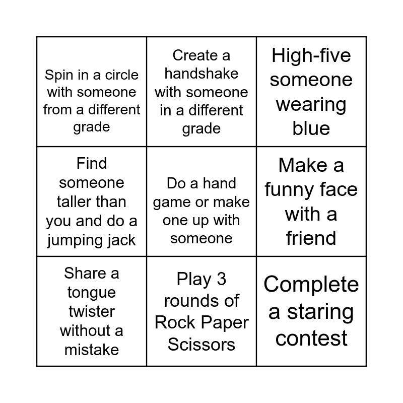 This bingo card has 9 words: Share a tongue twister without a mistake, High-five someone wearing blue, Create a handshake with someone in a different grade, Find someone taller than you and do a jumping jack, Spin in a circle with someone from a different grade, Make a funny face with a friend, Do a hand game or make one up with someone, Complete a staring contest and Play 3 rounds of Rock Paper Scissors.