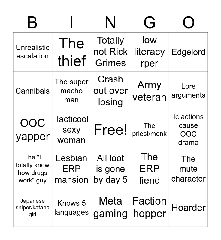 This bingo card has a free space and 24 words: Lesbian ERP mansion, Knows 5 languages, Crash out over losing, Japanese sniper/katana girl, Edgelord, Unrealistic escalation, Cannibals, The thief, The priest/monk, All loot is gone by day 5, Army veteran, OOC yapper, The ERP fiend, The mute character, The super macho man, Faction hopper, Ic actions cause OOC drama, Totally not Rick Grimes, Lore arguments, Tacticool sexy woman, Hoarder, The "I totally know how drugs work" guy, low literacy rper and Meta gaming.