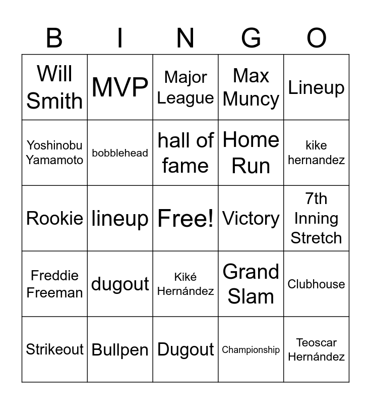 This bingo card has a free space and 54 words: Tommy Edman, Freddie Freeman, Mookie Betts, Shohei Ohtani, Kiké Hernández, Brustar Graterol, Max Muncy, Gavin Lux, Yoshinobu Yamamoto, Walker Buehler, Will Smith, Dodger Dog, Bullpen, Strikeout, Playoffs, Dugout, Teoscar Hernández, Home Run, Home Base, 7th Inning Stretch, Grand Slam, Bobblehead, Victory, Lineup, Manager Dave, MVP, Fastball, Aaron Judge, Hall of Fame, Championship, World Series Ring, Game 4, Curveball, Fireworks, Major League, Bases Loaded, Rookie, Clubhouse, Vin Scully, bobblehead, curveball, dodger dog, fastball, playoffs, dugout, major league, world series ring, rookie, hall of fame, lineup, kike hernandez, mookie betts, tommy edman and vin scully.