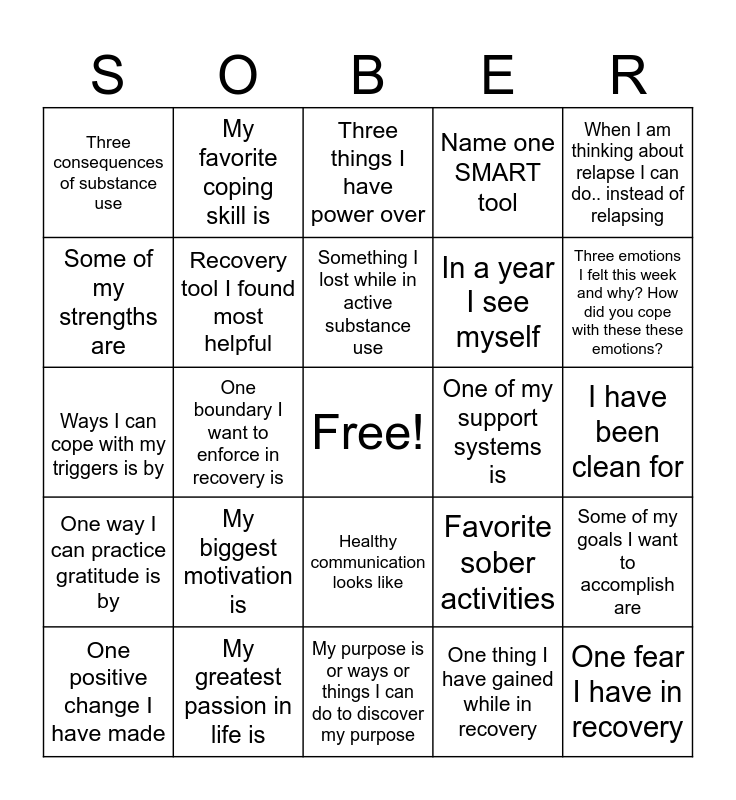 This bingo card has a free space and 24 words: One positive change I have made, My biggest motivation is, Something I lost while in active substance use, One thing I have gained while in recovery, When I am thinking about relapse I can do.. instead of relapsing, Three consequences of substance use, My favorite coping skill is, Three things I have power over, One of my support systems is, I have been clean for, Ways I can cope with my triggers is by, Recovery tool I found most helpful, Favorite sober activities, Some of my goals I want to accomplish are, Some of my strengths are, My greatest passion in life is, My purpose is or ways or things I can do to discover my purpose, Name one SMART tool, Three emotions I felt this week and why? How did you cope with these these emotions?, One way I can practice gratitude is by, One boundary I want to enforce in recovery is, Healthy communication looks like, In a year I see myself and One fear I have in recovery.