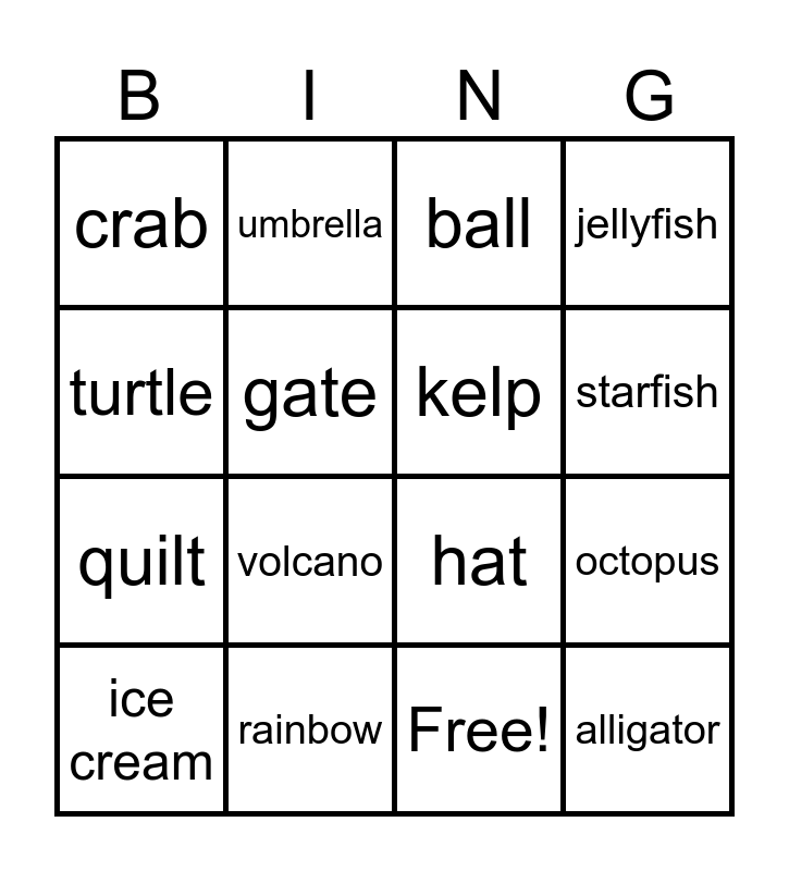 This bingo card has 17 words: Free!, ice cream, ball, crab, volcano, jellyfish, octopus, kelp, starfish, gate, rainbow, hat, turtle, umbrella, quilt, fish and alligator.