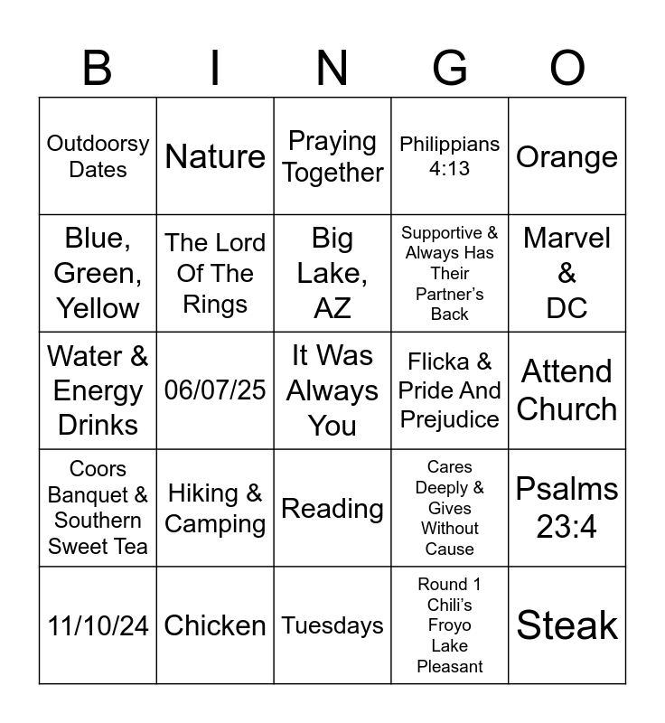 This bingo card has a free space and 29 words: 11/10/24, Lego Date Nights, 06/07/25, Oceanside Beach, Outdoorsy Dates, Praying Together, The Lord Of The Rings, Hiking & Camping, Flicka & Pride And Prejudice, Chicken, Attend Church, Steak, Tuesdays, Round 1 Chili’s Froyo Lake Pleasant, Marvel & DC, Hunting & Fishing, Reading, Coors Banquet & Southern Sweet Tea, Orange, Water & Energy Drinks, Cares Deeply & Gives Without Cause, Mutual Friend, Supportive & Always Has Their Partner’s Back, Blue, Green, Yellow, Philippians 4:13, Nature, Psalms 23:4, Big Lake, AZ and In God’s Creation.