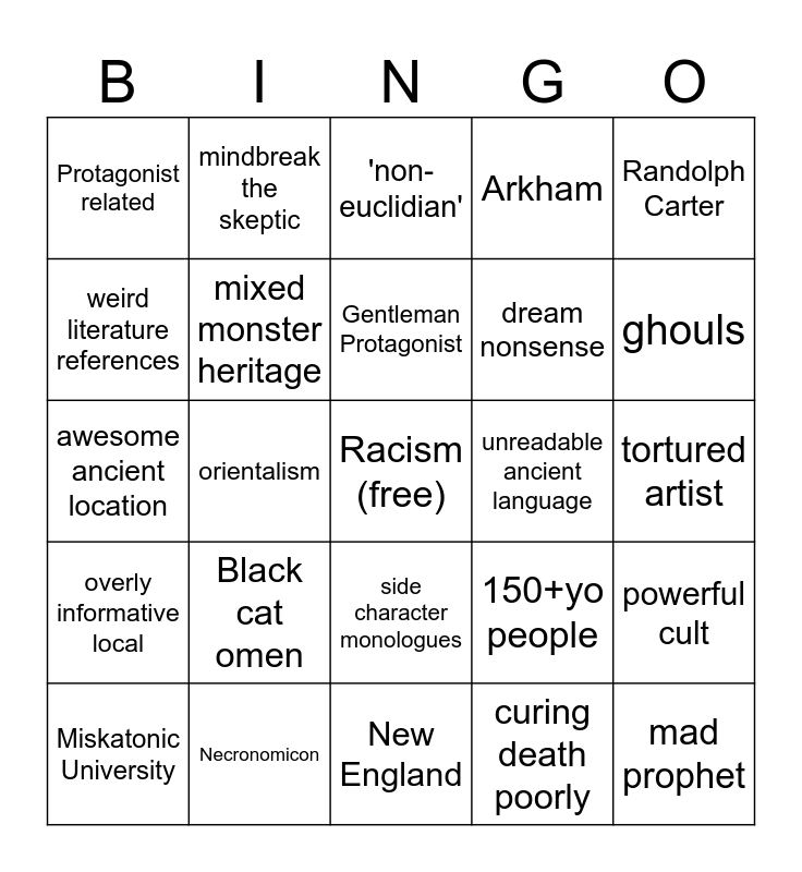 This bingo card has a free space and 24 words: Black cat omen, Necronomicon, Gentleman Protagonist, Miskatonic University, Randolph Carter, Protagonist related, weird literature references, mindbreak the skeptic, unreadable ancient language, side character monologues, dream nonsense, awesome ancient location, 150+yo people, powerful cult, mixed monster heritage, curing death poorly, tortured artist, 'non-euclidian', ghouls, orientalism, mad prophet, overly informative local, Arkham and New England.