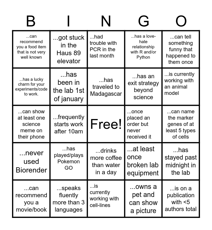 This bingo card has a free space and 24 words: ...has played/plays Pokemon GO, ...speaks fluently more than 3 languages, ...has traveled to Madagascar, ...can recommend you a movie/book, ...can tell something funny that happened to them once, ...can recommend you a food item that is not very well known, ...has a lucky charm for your experiments/code to work., ...got stuck in the Haus 89 elevator, ...once placed an order but never received it, ...drinks more coffee than water in a day, ...has an exit strategy beyond science, ...can show at least one science meme on their phone, ...at least once broken lab equipment, ...has stayed past midnight in the lab, ...has been in the lab 1st of january, ...owns a pet and can show a picture, ...can name the marker genes of at least 5 types of cells, ...had trouble with PCR in the last month, ...is currently working with an animal model, ...frequently starts work after 10am, ...is on a publication with <5 authors total, ...never used Biorender, ...has a love-hate relationship with R and/or Python and ...is currently working with cell-lines.