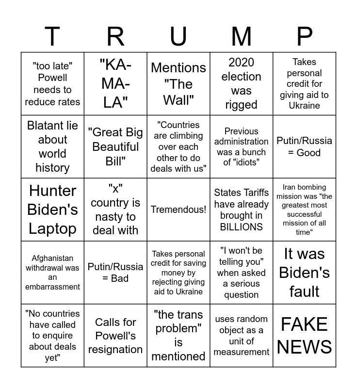 This bingo card has a free space and 24 words: Putin/Russia = Bad, Calls for Powell's resignation, "Countries are climbing over each other to do deals with us", "No countries have called to enquire about deals yet", Takes personal credit for giving aid to Ukraine, "too late" Powell needs to reduce rates, Blatant lie about world history, "KA-MA-LA", States Tariffs have already brought in BILLIONS, Takes personal credit for saving money by rejecting giving aid to Ukraine, Previous administration was a bunch of "idiots", Hunter Biden's Laptop, "I won't be telling you" when asked a serious question, It was Biden's fault, "Great Big Beautiful Bill", uses random object as a unit of measurement, Iran bombing mission was "the greatest most successful mission of all time", Mentions "The Wall", Putin/Russia = Good, "x" country is nasty to deal with, FAKE NEWS, Afghanistan withdrawal was an embarrassment, 2020 election was rigged and "the trans problem" is mentioned.