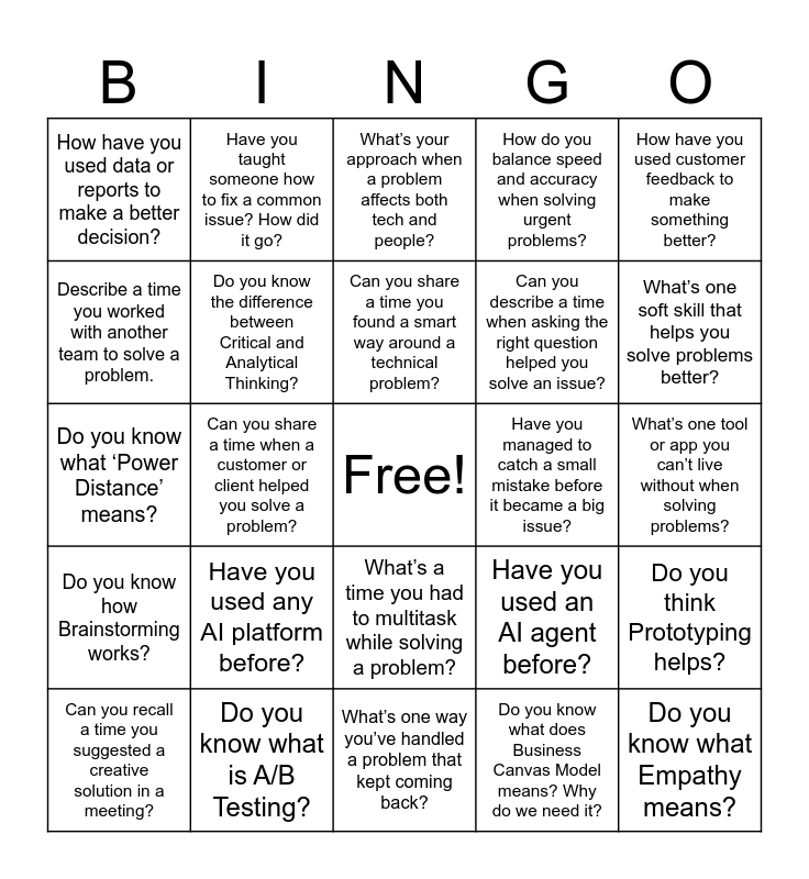 This bingo card has a free space and 24 words: Have you used any AI platform before?, Do you know what is A/B Testing?, Can you share a time you found a smart way around a technical problem?, Can you recall a time you suggested a creative solution in a meeting?, How have you used customer feedback to make something better?, How have you used data or reports to make a better decision?, Describe a time you worked with another team to solve a problem., Have you taught someone how to fix a common issue? How did it go?, Have you managed to catch a small mistake before it became a big issue?, What’s a time you had to multitask while solving a problem?, Can you describe a time when asking the right question helped you solve an issue?, Do you know what ‘Power Distance’ means?, Have you used an AI agent before?, Do you think Prototyping helps?, Do you know the difference between Critical and Analytical Thinking?, Do you know what does Business Canvas Model means? Why do we need it?, What’s one tool or app you can’t live without when solving problems?, What’s your approach when a problem affects both tech and people?, What’s one soft skill that helps you solve problems better?, Can you share a time when a customer or client helped you solve a problem?, Do you know what Empathy means?, Do you know how Brainstorming works?, How do you balance speed and accuracy when solving urgent problems? and What’s one way you’ve handled a problem that kept coming back?.
