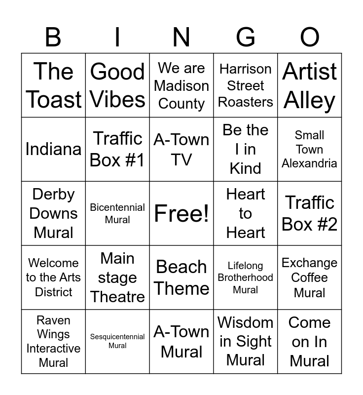 This bingo card has a free space and 24 words: Main stage Theatre, Sesquicentennial Mural, A-Town TV, Raven Wings Interactive Mural, Artist Alley, The Toast, Indiana, Good Vibes, Heart to Heart, Beach Theme, Be the I in Kind, Derby Downs Mural, Lifelong Brotherhood Mural, Exchange Coffee Mural, Traffic Box #1, Wisdom in Sight Mural, Traffic Box #2, We are Madison County, Small Town Alexandria, Bicentennial Mural, Come on In Mural, Welcome to the Arts District, Harrison Street Roasters and A-Town Mural.