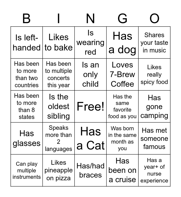 This bingo card has a free space and 24 words: Speaks more than 2 languages, Likes pineapple on pizza, Is an only child, Can play multiple instruments, Shares your taste in music, Is left-handed, Has been to more than two countries, Likes to bake, Has the same favorite food as you, Has a Cat, Loves 7-Brew Coffee, Has been to more than 8 states, Was born in the same month as you, Has met someone famous, Has been to multiple concerts this year, Has been on a cruise, Has gone camping, Is wearing red, Likes really spicy food, Is the oldest sibling, Has a year+ of nurse experience, Has glasses, Has a dog and Has/had braces.