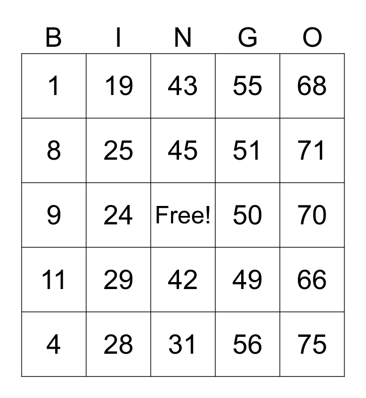 This bingo card has a free space and 24 words: 4, 29, 45, 56, 68, 1, 19, 43, 50, 70, 9, 25, 49, 66, 8, 28, 31, 55, 71, 11, 24, 42, 51 and 75.