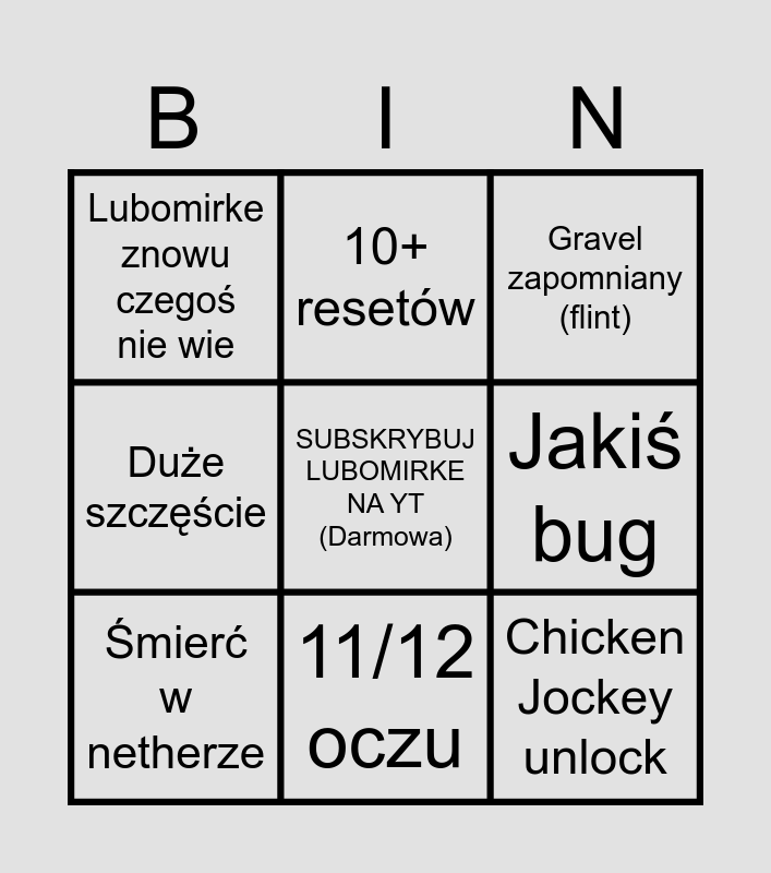 This bingo card has a free space and 11 words: Lubo umiera przed netherem, 11/12 oczu, Chicken Jockey unlock, Śmierć w netherze, 10+ resetów, Gravel zapomniany (flint), Jakiś bug, Struktura w strukturze, Duże szczęście, Lubomirke znowu czegoś nie wie and Death loop (ciągłe umieranie).