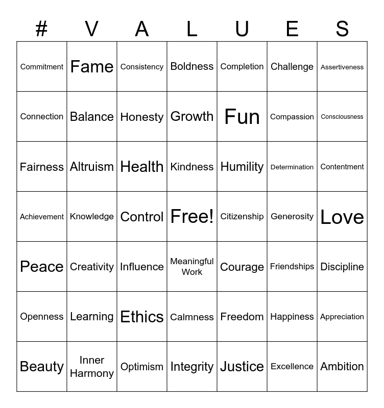 This bingo card has a free space and 62 words: Accountability, Achievement, Adventure, Altruism, Ambition, Appreciation, Assertiveness, Authenticity, Balance, Beauty, Boldness, Calmness, Challenge, Citizenship, Closeness, Commitment, Compassion, Completion, Confidence, Connection, Consciousness, Consistency, Contentment, Control, Cooperation, Courage, Creativity, Curiosity, Determination, Discipline, Equality, Ethics, Excellence, Family, Fairness, Fame, Freedom, Friendships, Fun, Generosity, Growth, Happiness, Health, Helpfulness, Honesty, Humility, Influence, Inner Harmony, Integrity, Justice, Kindness, Knowledge, Leadership, Learning, Loyalty, Love, Meaningful Work, Openness, Optimism, Passion, Peace and Pleasure.