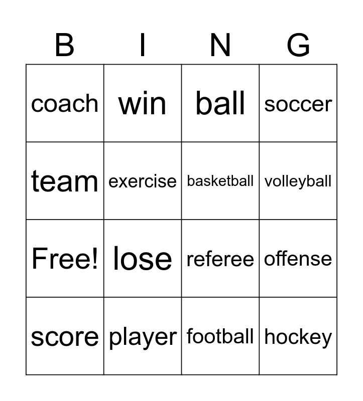 This bingo card has 20 words: offense, defense, ball, points, score, team, player, coach, Free!, win, lose, referee, exercise, hockey, basketball, baseball, volleyball, soccer, football and sports.