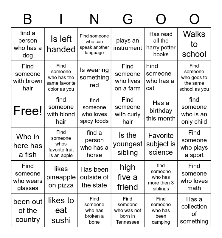 This bingo card has 36 words: high five a friend, Has been outside of the state, Find someone who was not born in Tennessee, Find someone with brown hair, Who in here has a fish, Find someone with curly hair, Find someone who has the same favorite color as you, Find someone who has broken a bone, Has read all the harry potter books, find someone who has more then 3 siblings, Find someone who goes to the same school as you, plays an instrument, Find someone who loves math, find someone with blond hair, Find someone who lives on a farm, find a person who has a dog, Find someone who wears glasses, Has a birthday this month, Free!, Find someone who can speak another language, find someone who loves spicy foods, Find someone whos favorite fruit is an apple, Is the youngest sibling, find a person who has a horse, Favorite subject is science, Is left handed, Find someone who has a cat, likes to eat sushi, Is wearing something red, Walks to school, Has a collection of something, been out of the country, Find someone who plays a sport, find someone who is an only child, likes pineapple on pizza and Find someone who has been camping.