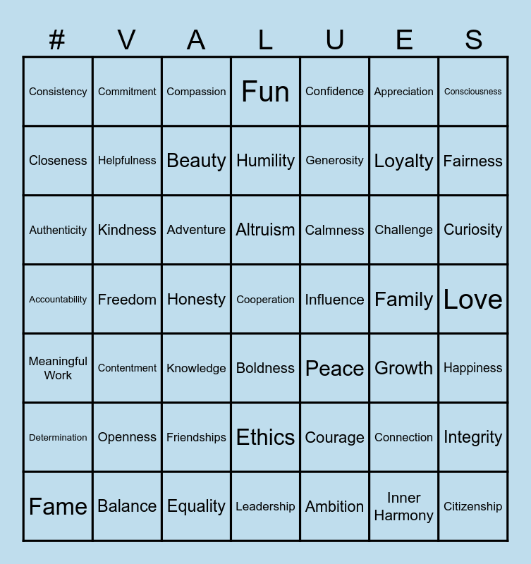 This bingo card has 63 words: Free!, Accountability, Achievement, Adventure, Altruism, Ambition, Appreciation, Assertiveness, Authenticity, Balance, Beauty, Boldness, Calmness, Challenge, Citizenship, Closeness, Commitment, Compassion, Completion, Confidence, Connection, Consciousness, Consistency, Contentment, Control, Cooperation, Courage, Creativity, Curiosity, Determination, Discipline, Equality, Ethics, Excellence, Family, Fairness, Fame, Freedom, Friendships, Fun, Generosity, Growth, Happiness, Health, Helpfulness, Honesty, Humility, Influence, Inner Harmony, Integrity, Justice, Kindness, Knowledge, Leadership, Learning, Loyalty, Love, Meaningful Work, Openness, Optimism, Passion, Peace and Pleasure.