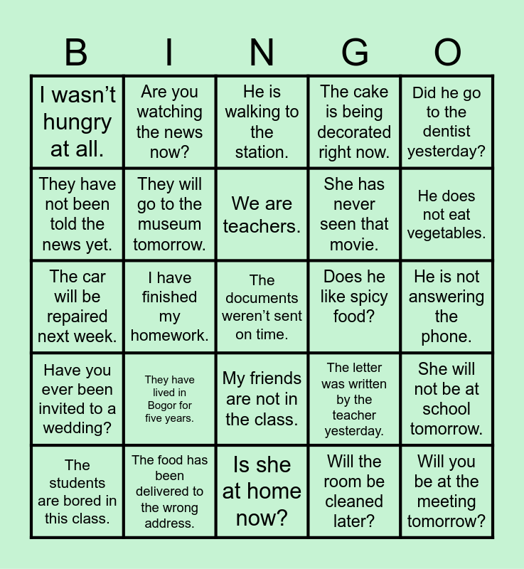 This bingo card has 25 words: They have lived in Bogor for five years., Is she at home now?, We are teachers., The students are bored in this class., Did he go to the dentist yesterday?, I wasn’t hungry at all., They have not been told the news yet., Are you watching the news now?, Does he like spicy food?, My friends are not in the class., She has never seen that movie., The car will be repaired next week., The letter was written by the teacher yesterday., She will not be at school tomorrow., They will go to the museum tomorrow., Will you be at the meeting tomorrow?, He is not answering the phone., He is walking to the station., He does not eat vegetables., I have finished my homework., The documents weren’t sent on time., The food has been delivered to the wrong address., Have you ever been invited to a wedding?, The cake is being decorated right now. and Will the room be cleaned later?.