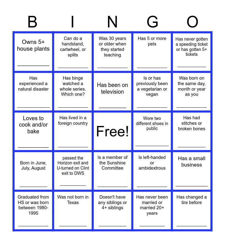 This bingo card has a free space and 24 words: Graduated from HS or was born between 1980-1995 ____________, passed the Horizon exit and U-turned on Clint exit to DWS ___________, Has been on television _________, Has never been married or married 20+ years __________, Has never gotten a speeding ticket or has gotten 5+ tickets ____________, Owns 5+ house plants __________, Can do a handstand, cartwheel, or splits ____________, Was 30 years or older when they started teaching ____________, Wore two different shoes in public ______________, Has had stitches or broken bones ___________, Loves to cook and/or bake __________, Has binge watched a whole series. Which one? ____________, Is left-handed or ambidextrous ____________, Has a small business ___________, Has experienced a natural disaster _____________, Was not born in Texas ___________, Doesn't have any siblings or 4+ siblings ___________, Has 5 or more pets ____________, Was born on the same day, month or year as you ____________, Born in June, July, August ___________, Has lived in a foreign country ____________, Is a member of the Sunshine Committee ____________, Is or has previously been a vegetarian or vegan ____________ and Has changed a tire before ____________.