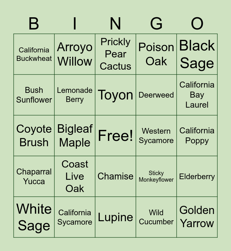 This bingo card has a free space and 24 words: Coast Live Oak, California Sycamore, Toyon, White Sage, Black Sage, California Buckwheat, Bush Sunflower, Arroyo Willow, Western Sycamore, Chamise, Deerweed, Coyote Brush, Sticky Monkeyflower, Elderberry, Lemonade Berry, Wild Cucumber, California Poppy, Prickly Pear Cactus, California Bay Laurel, Bigleaf Maple, Golden Yarrow, Chaparral Yucca, Poison Oak and Lupine.