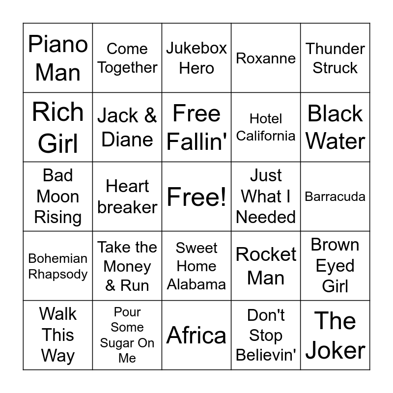 This bingo card has a free space and 29 words: Walk This Way, Horse with No Name, Heart breaker, More Than A Feeling, Piano Man, Jukebox Hero, Jack & Diane, Take the Money & Run, Just What I Needed, Pour Some Sugar On Me, Barracuda, The Joker, Africa, Don't Stop Believin', Black Water, Taking Care of Business, Sweet Home Alabama, Bohemian Rhapsody, Thunder Struck, Bad Moon Rising, Rocket Man, Smoke on the Water, Hotel California, Rich Girl, Roxanne, Come Together, Brown Eyed Girl, Free Fallin' and Start Me Up.