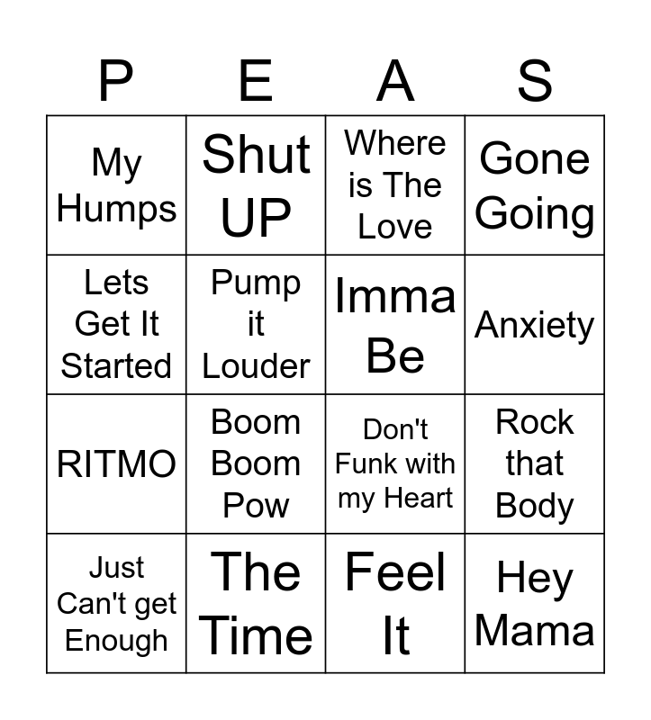 This bingo card has 20 words: Rock that Body, I Gotta Feeling, Where is The Love, Pump It, Just Can't get Enough, Lets Get It Started, The Time, My Humps, RITMO, Shut UP, Boom Boom Pow, Don't Funk with my Heart, Pump it Louder, Hey Mama, Imma Be, Don't Lie, Anxiety, Gone Going, Feel It and Alive.