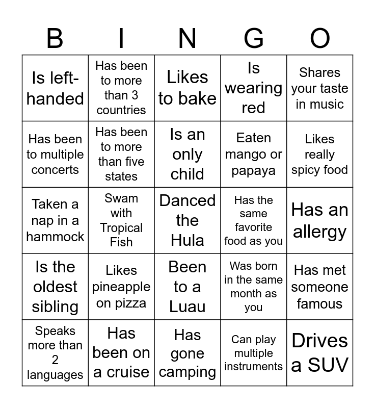This bingo card has a free space and 24 words: Speaks more than 2 languages, Likes pineapple on pizza, Is an only child, Can play multiple instruments, Shares your taste in music, Is left-handed, Has been to more than 3 countries, Likes to bake, Has the same favorite food as you, Has an allergy, Taken a nap in a hammock, Has been to more than five states, Was born in the same month as you, Has met someone famous, Has been to multiple concerts, Has been on a cruise, Has gone camping, Is wearing red, Likes really spicy food, Is the oldest sibling, Swam with Tropical Fish, Been to a Luau, Eaten mango or papaya and Drives a SUV.