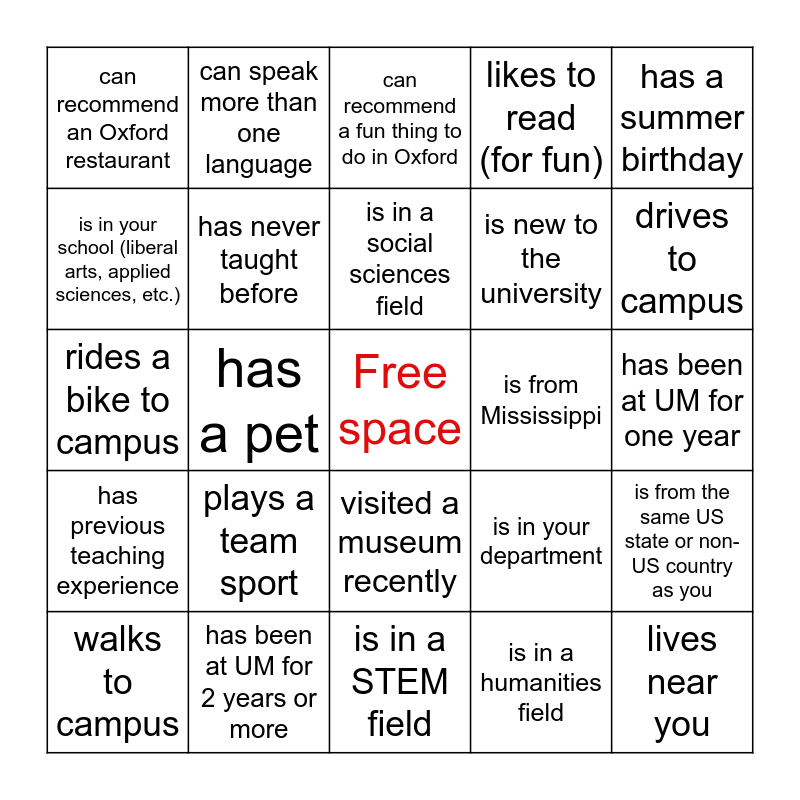 This bingo card has a free space and 24 words: plays a team sport, has been at UM for 2 years or more, is in a social sciences field, walks to campus, has a summer birthday, can recommend an Oxford restaurant, is in your school (liberal arts, applied sciences, etc.), can speak more than one language, is from Mississippi, visited a museum recently, is new to the university, rides a bike to campus, is in your department, is from the same US state or non-US country as you, has never taught before, is in a humanities field, has been at UM for one year, can recommend a fun thing to do in Oxford, drives to campus, has a pet, lives near you, has previous teaching experience, likes to read (for fun) and is in a STEM field.