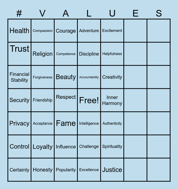 This bingo card has a free space and 61 words: Certainty, Acceptance, Appreciation, Accountability, Authenticity, Control, Compassion, Authority, Adventure, Contribution, Financial Stability, Family, Beauty, Ambition, Commitment, Health, Forgiveness, Competence, Equality, Security, Friendship, Courage, Challenge, Creativity, Peace, Honesty, Fame, Curiosity, Excitement, Privacy, Love, Influence, Determination, Ethics, Trust, Loyalty, Popularity, Discipline, Freedom, Religion, Reputation, Excellence, Helpfulness, Teamwork, Respect, Growth, Independence, Tradition, Uniqueness, Intelligence, Inner Harmony, Wealth, Success, Justice, Variety, Meaningful Work, Wisdom, Passion, Pleasure, Spirituality and Tolerance.