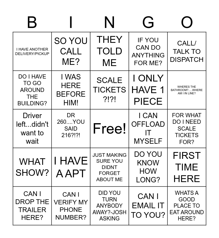 This bingo card has a free space and 24 words: I HAVE A APT, CAN I VERIFY MY PHONE NUMBER?, SCALE TICKETS ?!?!, CAN I DROP THE TRAILER HERE?, CALL/ TALK TO DISPATCH, I HAVE ANOTHER DELIVERY/PICKUP, DO I HAVE TO GO AROUND THE BUILDING?, SO YOU CALL ME?, I CAN OFFLOAD IT MYSELF, JUST MAKING SURE YOU DIDNT FORGET ABOUT ME, I ONLY HAVE 1 PIECE, Driver left...didn't want to wait, DO YOU KNOW HOW LONG?, FIRST TIME HERE, I WAS HERE BEFORE HIM!, CAN I EMAIL IT TO YOU?, FOR WHAT DO I NEED SCALE TICKETS FOR?, THEY TOLD ME, WHERES THE BATHROOM?.....WHERE AM I IN LINE?, DR 260....YOU SAID 216?!?!, WHATS A GOOD PLACE TO EAT AROUND HERE?, WHAT SHOW?, IF YOU CAN DO ANYTHING FOR ME? and DID YOU TURN ANYBODY AWAY?-JOSH ASKING.