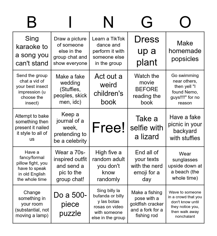 This bingo card has a free space and 24 words: Wear a 70s-inspired outfit and send a pic to the group chat!, Do a 500-piece puzzle, Act out a weird children's book, Change something in your room (substantial, not moving a lamp), Make homemade popsicles, Sing karaoke to a song you can't stand, Send the group chat a vid of your best insect impression (u choose the insect), Draw a picture of someone else in the group chat and show everyone, Take a selfie with a lizard, High five a random adult you don't know randomly, Watch the movie BEFORE reading the book, Attempt to bake something then present it nailed it style to all of us, End all of your texts with the nerd emoji for a day, Wear sunglasses upside down at a beach (the whole time), Make a fake wedding (Stuffies, peoples, skick men, idc), Make a fishing pose with a goldfish cracker and a fork for a fishing rod, Have a fake picnic in your backyard with stuffies, Learn a TikTok dance and perform it with someone else in the group, Go swimming near others, then yell "I found Nemo, guys!!!!" for no reason, Keep a journal of a week, pretending to be a celebrity, Wave to someone in a crowd that you don't know until they notice you, then walk away nonchalant, Have a fancy/formal pillow fight, you have to speak in old English the whole time, Dress up a plant and Sing billy la bufanda or billy y las botas rosas on video with someone else in the group.
